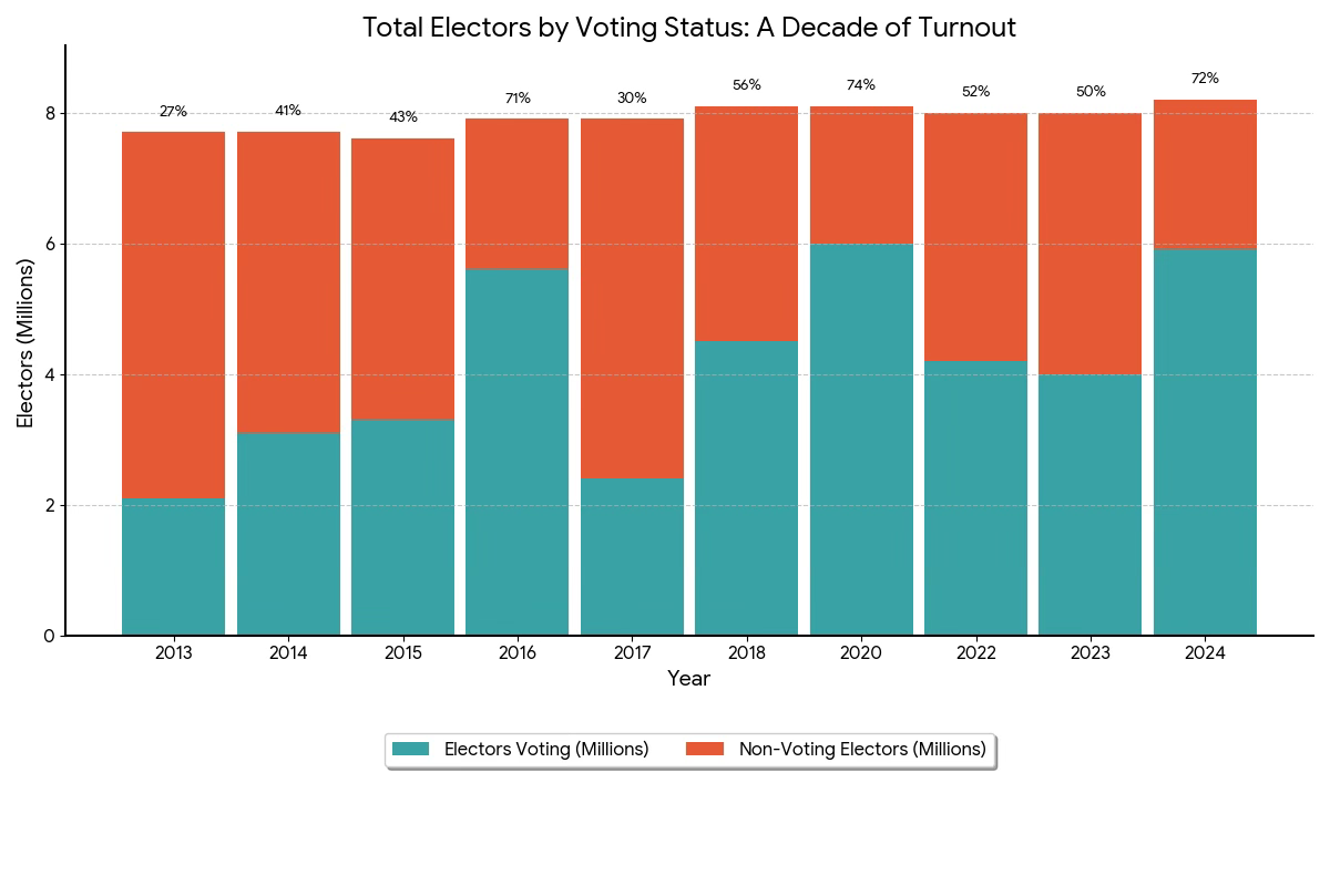 There are about 8.1 million registered voters in Ohio. The turnout in the last general election — November 2024 — was the second largest at 72%, in the last 10 years, according to state records. In 2020 the turnout was 74%.