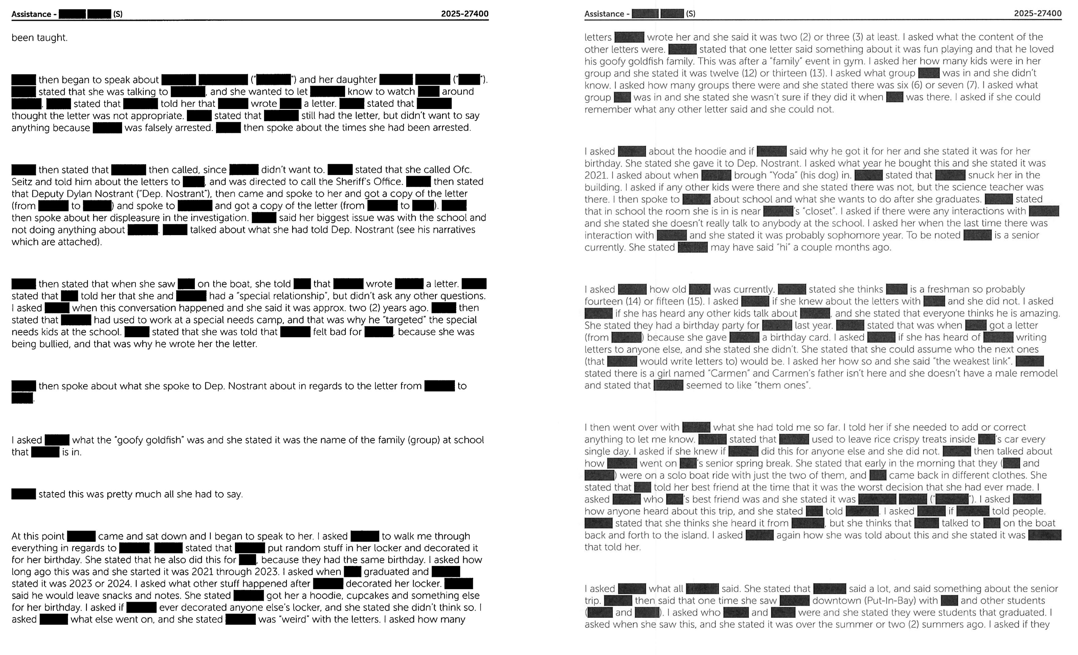 Below is a transcription summary of the 22-page redacted sheriff’s report filed April 8, 2026, by detectives related to their interviews with student families: