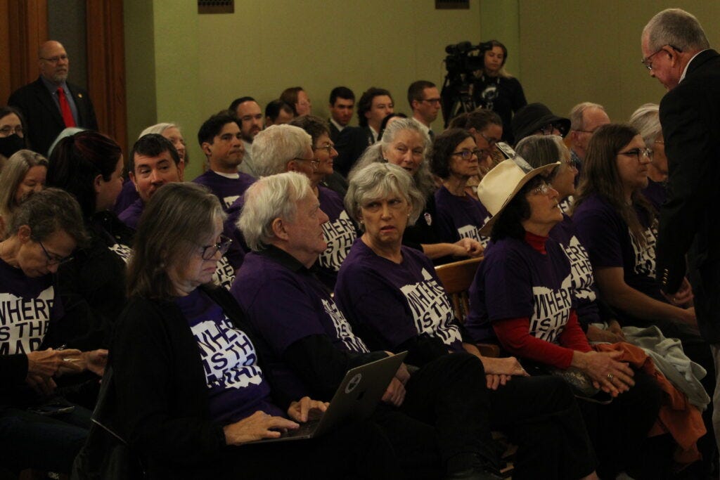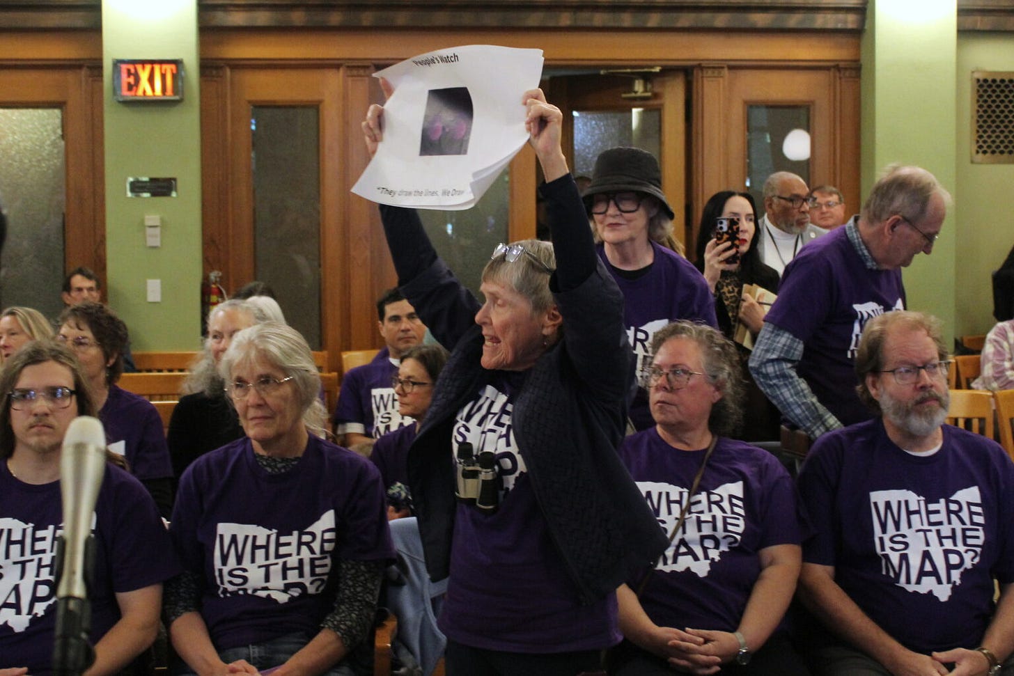 COLUMBUS — About two dozen activists showed up to Tuesday’s meeting of the Ohio Redistricting Commission wearing purple t-shirts that said “where is the map?”