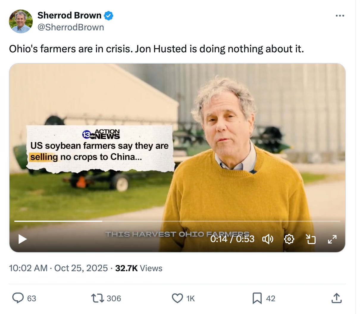 “Ohio farmers, American farmers, are in crisis,” Brown said. “For years, Ohio farmers, American farmers have sold billions of dollars, a billion dollars of soybeans to China. This harvest, Ohio farmers sold zero.”