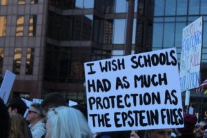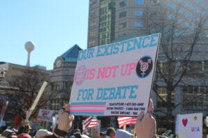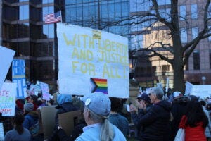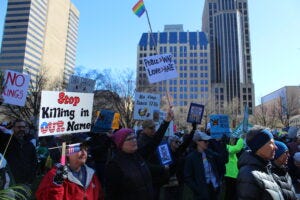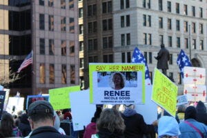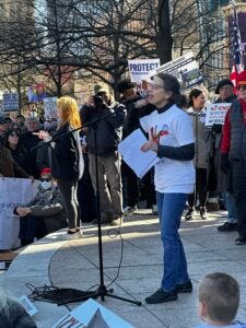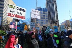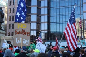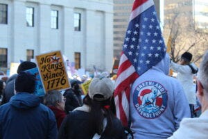 No Kings protesters at the Ohio Statehouse in Columbus on March 28, 2026. (Photo by David DeWitt, Ohio Capital Journal.) Dozens of No Kings protests took place across Ohio as part of more than 3,100 nationally.