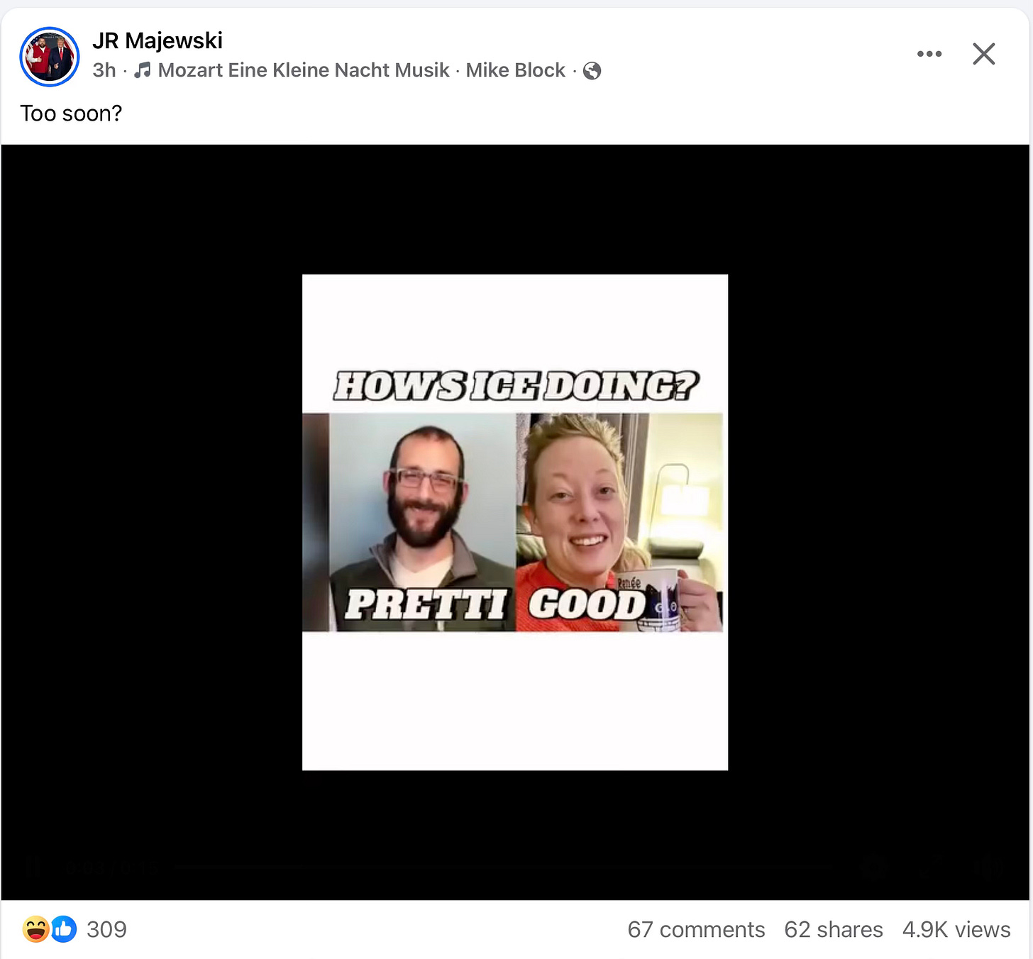 “Is it too soon,” Majewski wrote above photos of Renee Good and Alex Pretti. The header over the images read “How’s ICE Doing?” while the caption below—”Pretti Good”—puns the names of two citizens now dead at the hands of federal agents.