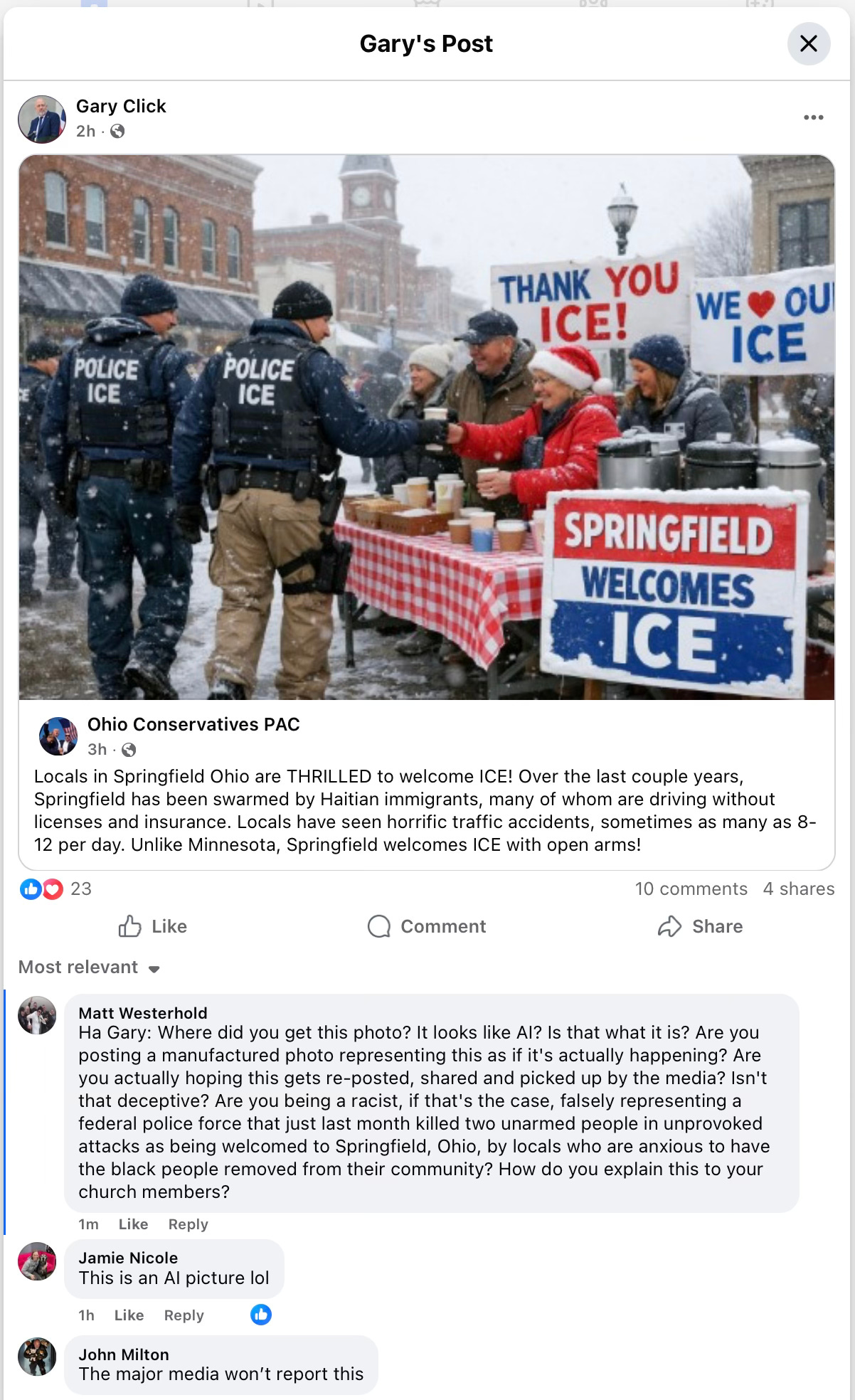 On Sunday, State Rep. Gary Click (R-Vickery) shared a fake photo on the Ohio Conservatives PAC Facebook page. The image depicts a sanitized, friendly scene: unmasked ICE agents chatting with Springfield locals over coffee at a welcome table, flanked by signs reading “THANK YOU ICE!” and “WE ❤️ OUR ICE.”