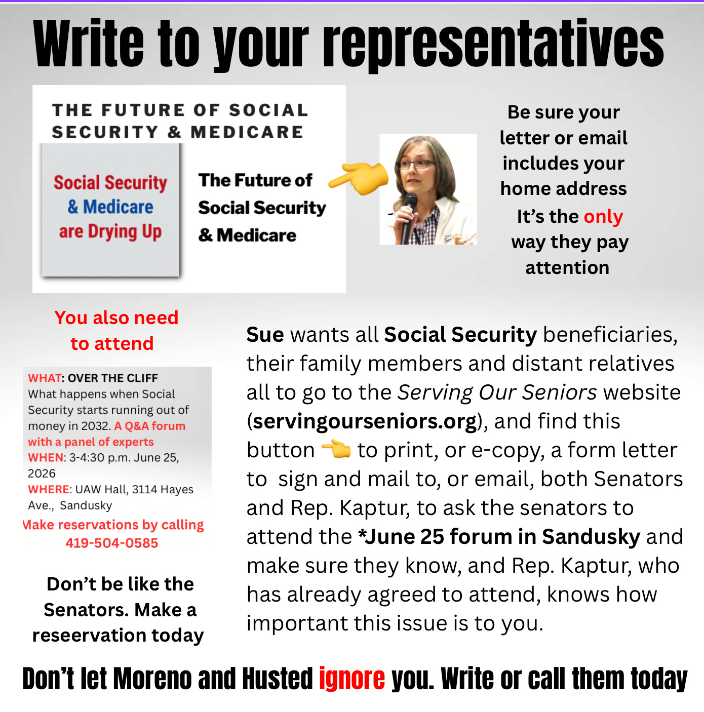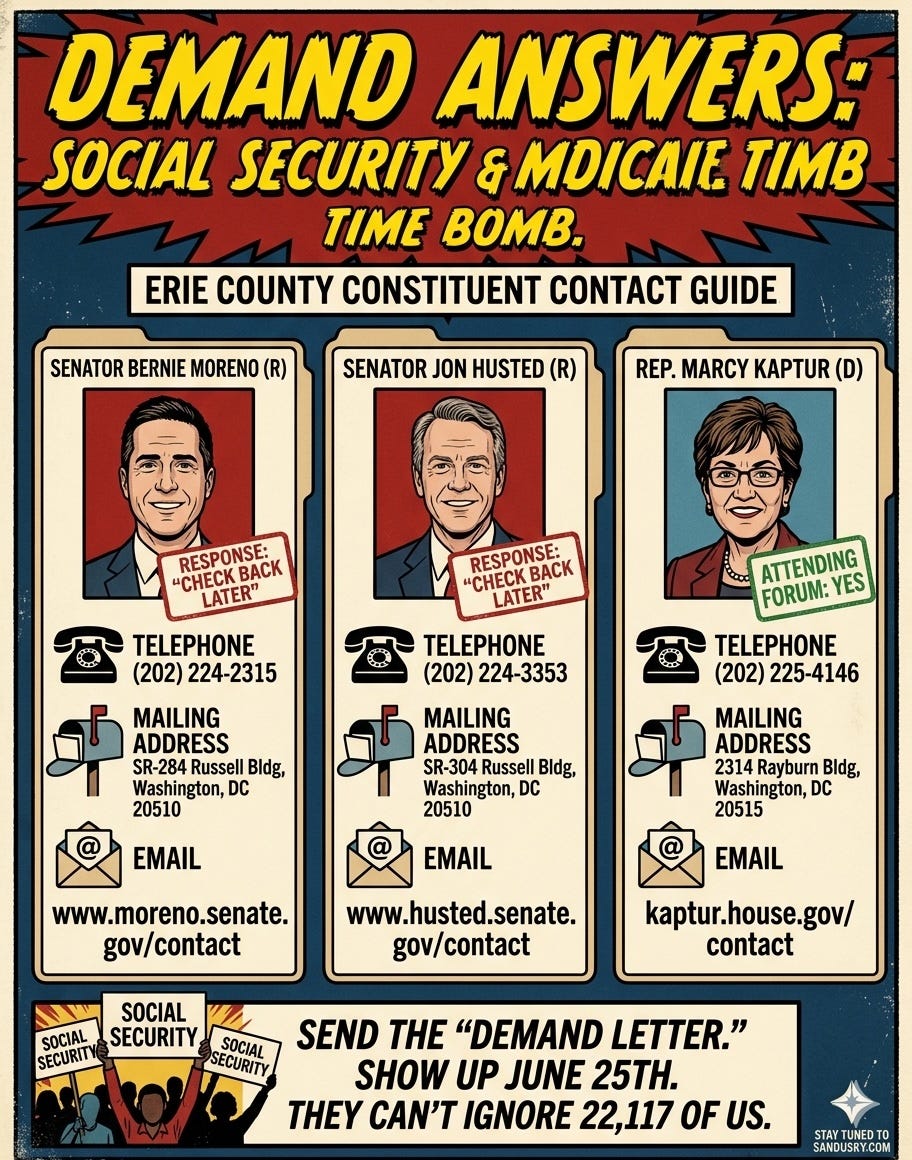 That was the response from the offices of U.S. Senators Bernie Moreno when asked to meet with Erie County seniors to discuss the future of Social Security. His counterpart in the Senate, Sen. Jon Husted’s staff, hasn’t got responded or even acknowledged the invite in months.